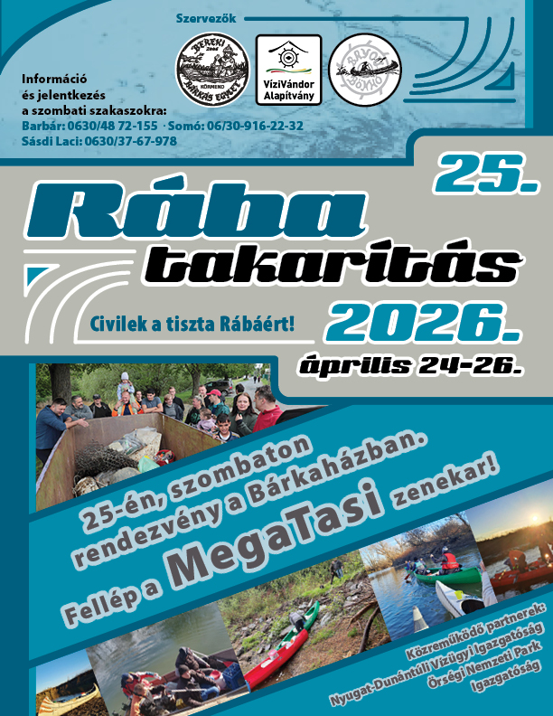 25. alkalommal takarítják végig a Rába folyó felső, közel 100 folyamkilométerét helyi és távoli települések vízi csapatai és önkéntesek. További információk a plakáton található telefonszámokon!
